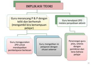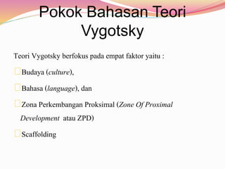 Implementasi Teori Perkembangan Kognitif Vygotsky dalam Pendidikan. Terdapat dua konsep penting dalam teori ini Slavin 1997 iaitu Zon Perkembangan Proximal ZPD dan bantuan scaffolding. Pada intinya dapat disimpulkan bahwa dalam teori Vygotsky mengandung banyak unsur psikologi pendidikan khususnya pokok bahasan pendidikan dan budayaSeperti Piaget Vygotsky menekankan bahwa anak-anak secara aktif menyusun pengetahuan mereka.